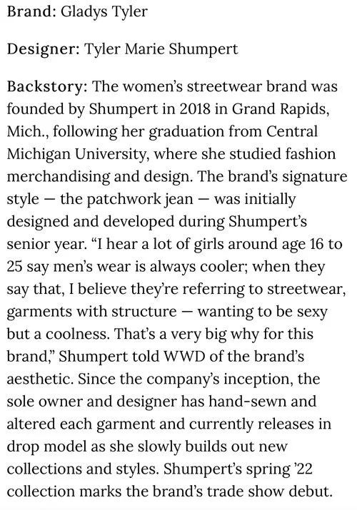 While working on Gladys Tyler one of my biggest accomplishments was a feature in WWD Magazine while exhibiting in Magic Las Vegas. I also had a wonderful time building relationships with influencers and working with stylists.