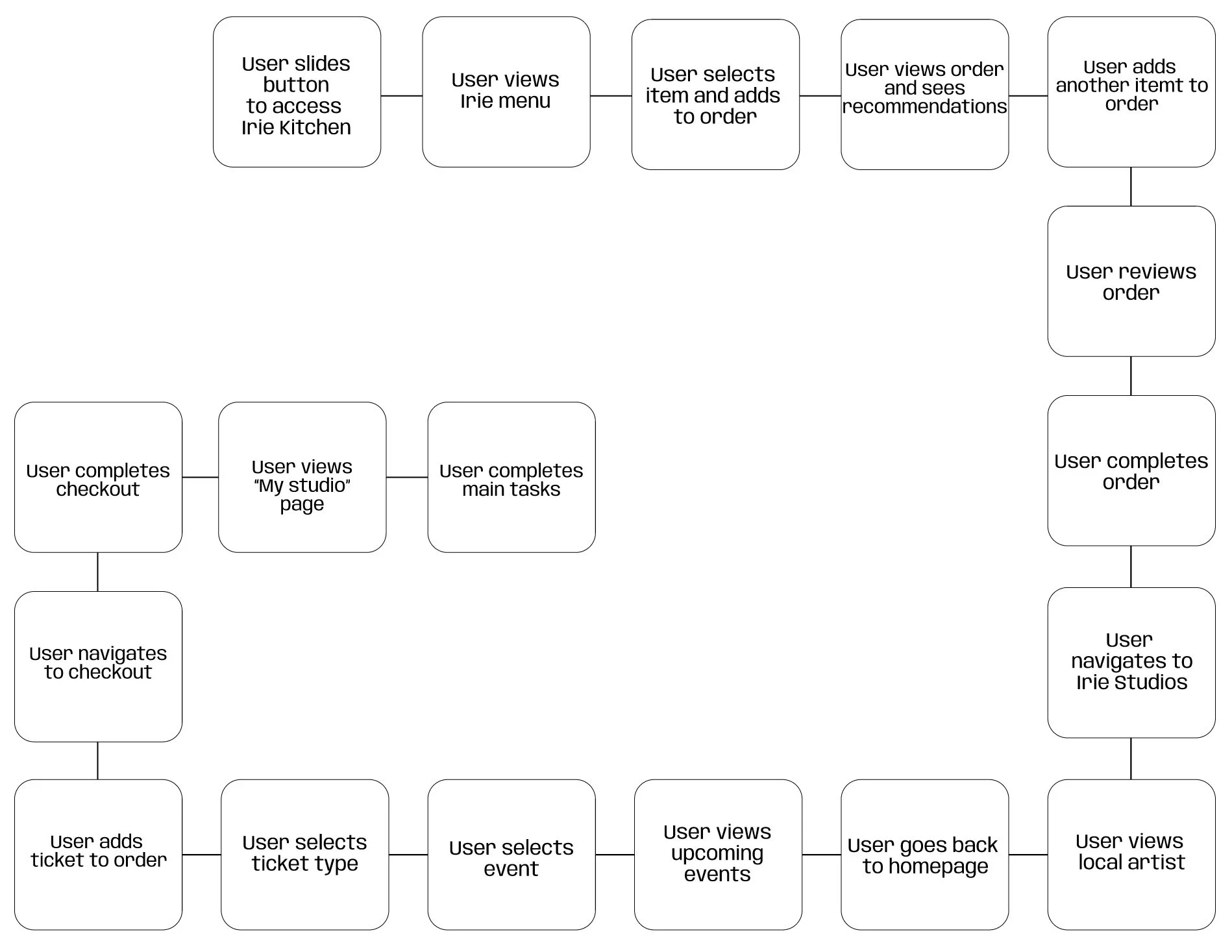 Before sketching I wanted to go through the basic user flow Irie’s customer will experience while completing tasks through the app. Creating the user flow before sketching helped me have a better idea on how to map out the paper wireframes.